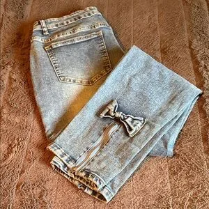 Stylish skinny jeans. Light blue wash. Cute bow detail and zipper on leg. Perfect for casual wear. 27” inseam 15” waist when laid flat