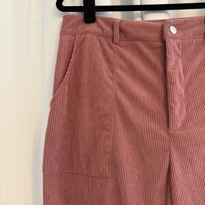 Mauve pink corduroy pants from Cider, featuring a flattering high-rise fit and wide leg silhouette. Designed with front patch pockets, a zip fly with button closure and soft ribbed corduroy texture that’s perfect for fall.