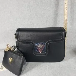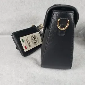 Keywords: Valentino Orlandi, black leather crossbody bag, designer handbag, coin pouch set, adjustable shoulder strap, luxury handbag, Italian designer, women's bag, elegant crossbody, evening bag, day to night bag, structured handbag, pebbled leather