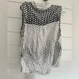 Chic sleeveless blouse with contrasting polka dots. Features a modern button-front style.