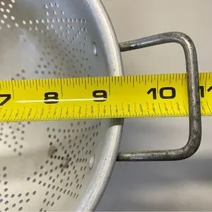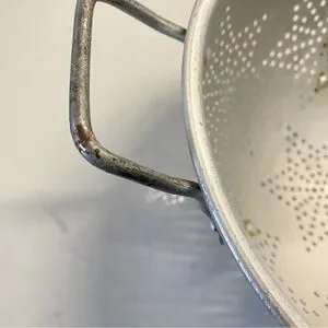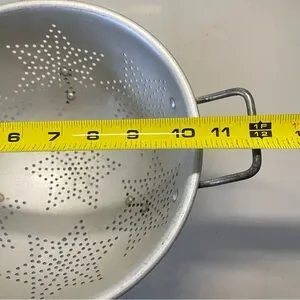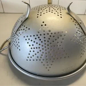 Enhance your kitchen with this stylish vintage aluminum colander featuring a unique star design. As with every vintage item it is nit perfect, small dent, discolorations and chipping on handle. Lovely rustic charm.