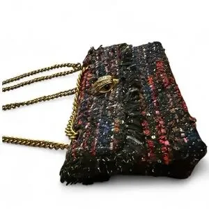 This gorgeous Kurt Geiger bag features a multicolored tweed exterior with red and blue stitching and frayed edges. It has a gold-tone two way chain strap and is finished with the brand's iconic eagle head embellishment on the front.
