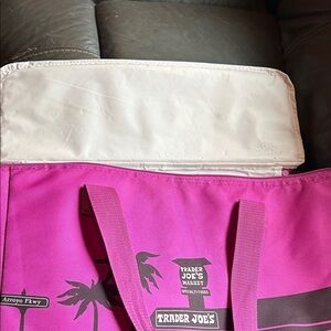 Stylish and spacious, this Trader Joe's tote bag is perfect for everyday use. The vibrant pink color adds a pop of fun to your outfit. Ideal for shopping or casual outings. The bag is insulated with no pockets inside.