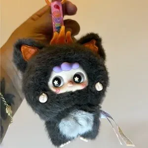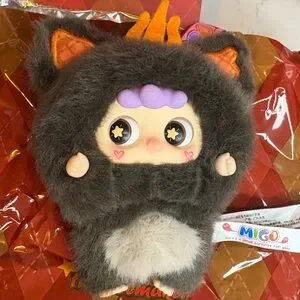 Adorable plush toy with starry eyes and fluffy fur. Features a cute design with orange and purple accents.