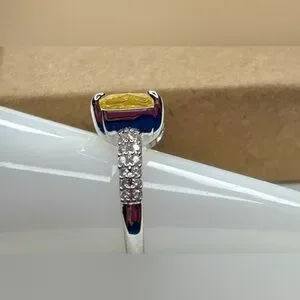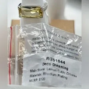 Elegant Deco Dreaming ring featuring a stunning lemon stone set in rhodium plating. Perfect for adding a touch of sophistication to any outfit.