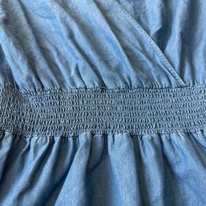 This is a beautiful blue chambray dress from MICHAEL Michael Kors. It features a faux wrap V-neckline, smocked elastic waist, and ruffled hem, giving it a stylish and flattering silhouette. The short, flutter sleeves and lightweight fabric make it a perfect choice for a casual day out or a special occasion. The dress is pre-owned and in great condition. Please note that the brand tag is visible in the image.