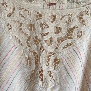 Free People Floating Memory peasant style long sleeve top. Crocheted lace around neckline and long sleeve. Elastic waistband and elastic on sleeves. Cream cotton with yellow, red, pink, and brown, small striped. Size XS