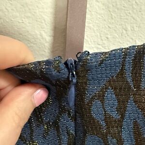 This is a beautiful dress that was only worn one time from the designer Vince Camuto. It is called the Jacquard Cap Sleeve Fit and Flare and it is in a stunning Navy and Gold Animal Print.