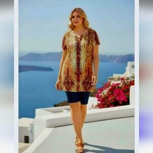 Avenue beautifully designed multicolor short sleeve top. Yellows, oranges and maroon red colors blend in a stunnning pattern! Features a generous flowy and pleated flattering long fit! Perfect for casual wear.