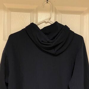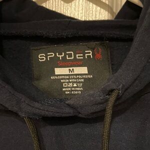 Classic Spyder hoodie in dark blue. Features adjustable drawstring hood and front pocket. Ideal for everyday wear.