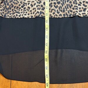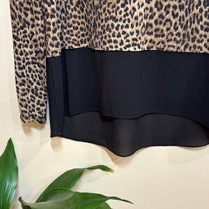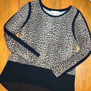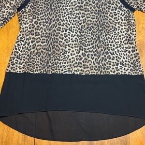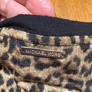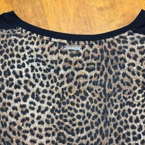 Chic animal print top in viscose knit. Features black semi-sheer trim. Michael Kors silver logo on upper back neckline. Ideal for stylish outings.