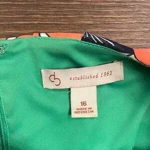 Vibrant green dress with floral pattern. Features orange and white flowers. Sleeveless design with a fitted waist.