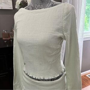Free People Mineral Sea two-piece set in light green. Featuring a textured gauze fabric with subtle stretch. Lightweight and breathable, this set transitions easily from day to night—pair with sandals for casual wear or heels for a night out. Original Price: $78