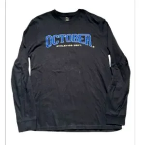 This black long sleeve tee features the "October Athletics Dept " by the brand Ovo October's Very Own by Drake, making it a stylish choice for fans of the music and hip hop themes. The regular fit and size make it suitable for men in size L. Perfect for casual wear, this t-shirt embodies Drake's iconic style and is a must-have for any fan looking to showcase their love for his music.