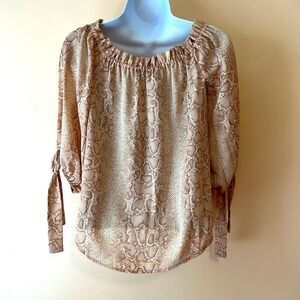 A cute blouse with ribbon tie 3/4 sleeves in a tan snakeskin print. This is brand new with tags by BCBGMAXAZRIA. Size xxs only.