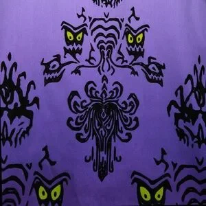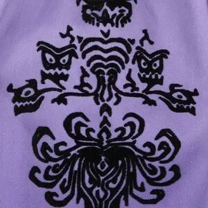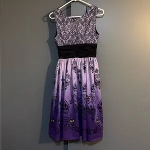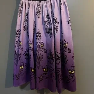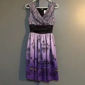 Created especially for Disney Resorts this Disney Dress Shop Haunted Mansion Wallpaper dress in a size XS has a lace screen art print bodice, black ruched band at the waist, and soft FLOCKED wallpaper print on the purple ombré skirt. This dress has a back zipper closure and POCKETS!!! The material is 97% cotton and 3% spandex.