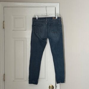 Kut from the Kloth jeans, size 4. Straight-leg jeans that can be cuffed or worn full length are cut from soft stretch denim in a versatile blue hue aged with faded areas and whiskered details. Small hole by back pocket - can be easily repaired (see photos). Perfect for all seasons and all styles.