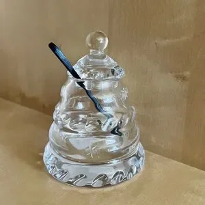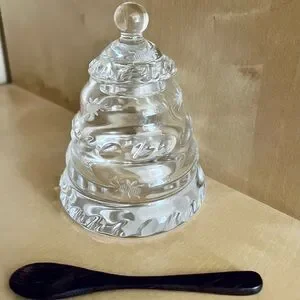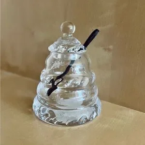Elegant crystal honey jar with lid and spoon. The hand cut bees add to the unique design! This jar is new with tag still attached (removed from box but never been used). Smoke free environment.