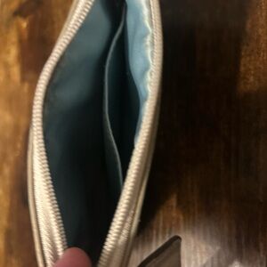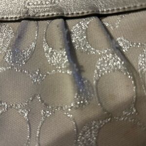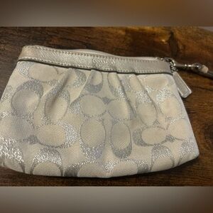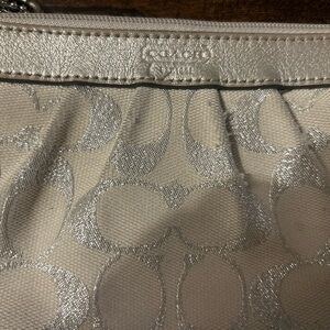 Chic Coach wristlet with metallic silver accents. Signature pattern in cream. Ideal for versatile styling. Some wear see pictures.