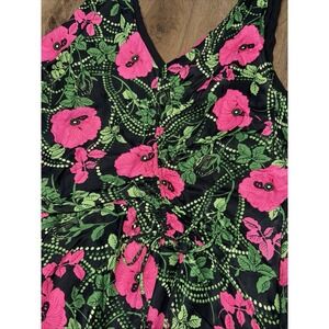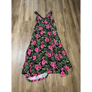 A vibrant statement piece, this sleeveless maxi dress bursts with a bold floral print. The dress features a flattering V-neckline and a comfortable, flowing silhouette. The eye-catching combination of pink and green florals against a black backdrop creates a striking visual impact. Perfect for a sunny picnic, a casual brunch with friends, or a relaxed evening stroll.