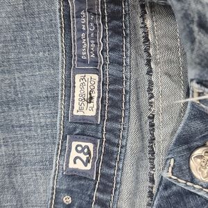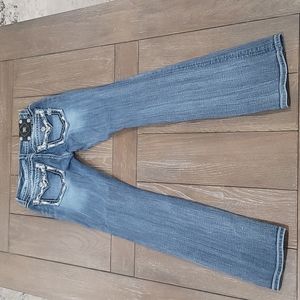 Stylish blue jeans with intricate pocket design. Features silver accents and signature logo. Straight leg fit.
