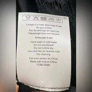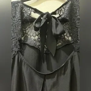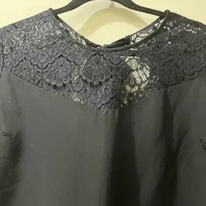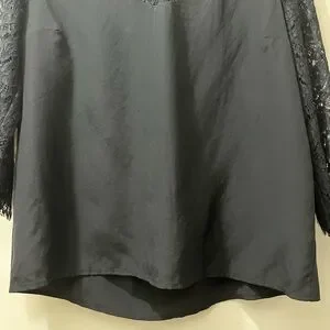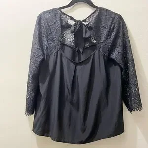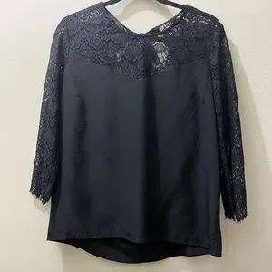 Black silk 3/4-sleeved blouse with lace shoulders, arms, and upper chest and back by Sézane, French size 40 (US 8). NOTE: I moved the brand tag to the top of the silk part of the back, so it no longer shows through the lace. Great used condition and freshly cleaned. Back silk bow closure. Please, NO RETURNS. Questions/offers welcome!