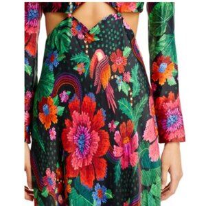 This dress features a flattering empire waist with flattering cut outs, long sleeves, and a flowing maxi length that moves beautifully. The vibrant print is typical of Farm Rio's maximalist Brazilian aesthetic - bold, joyful, and absolutely eye-catching!