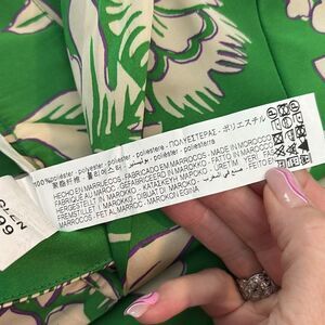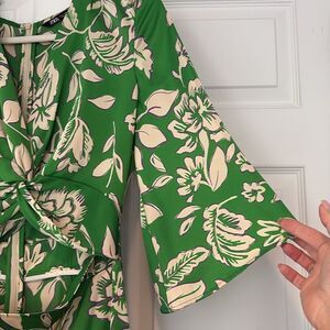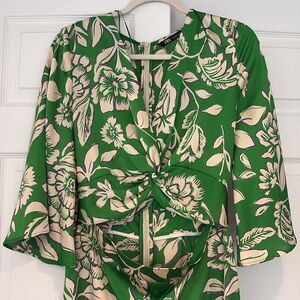 New without tags, ZARA Printed Twist Knot Top Jumpsuit Size L. Color Kelly Green with cream 100% polyester. Zipper in the back, three-quarter length sleeve, wide leg, open mid drift, and twist at bottom of top. See pictures for length and armpit to armpit measurements.