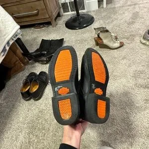 Stylish black leather motorcycle boots with buckle details. In great condition