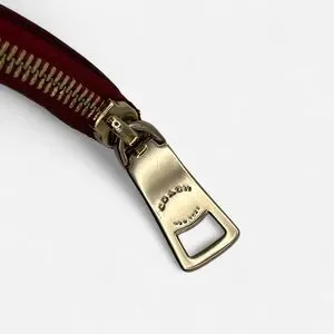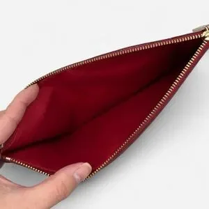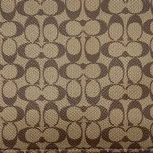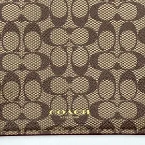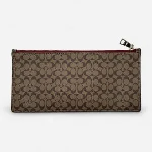 coach signature, logo pouch, brown red, fall accessory, designer wallet, canvas clutch, monogram pattern, zippered pouch, luxury bag, statement accessory