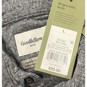 This men’s flannel shirt from Goodfellow & Co. is a midweight, standard-fit garment made of 80% cotton and 20% recycled cotton. It features a classic grey heathered pattern, suitable for year-round layering. The shirt has a button-up front, two chest pockets, and long sleeves with button cuffs. It is designed to be worn tucked or untucked for versatility.
