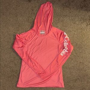 Columbia hooded long sleeve shirt in vibrant pink. Features logo on sleeve. Worn once