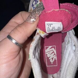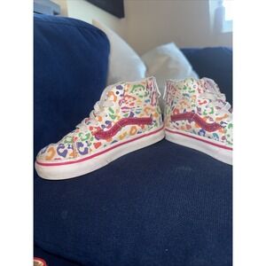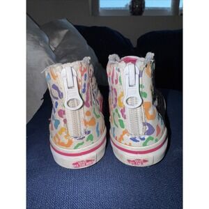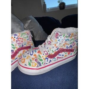 Vibrant Vans sneakers with a multicolor leopard print. High-top design. Perfect for kids.