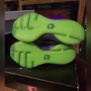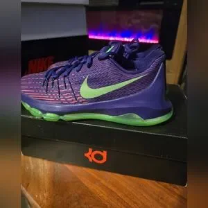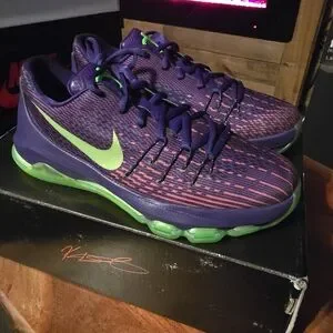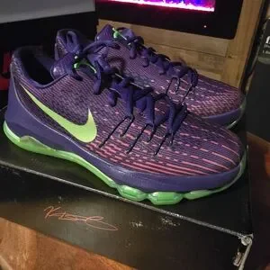 Dropping in 2014, the KD 8 ‘Suit’ draws inspiration from the ensemble that Durant wore during his emotional MVP acceptance speech from that same year. KD’s eighth signature shoe features a Flyweave upper in bright Court Purple, accented with even brighter pops of Green Strike on the tongue, semi-translucent rubber outsole and signature Swoosh.