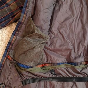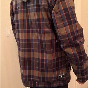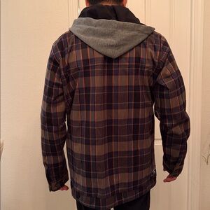 Burton jacket with a stylish plaid pattern. Features a cozy hood and zipper front with brass button closure. Ideal for skiing and snowboarding.
