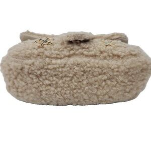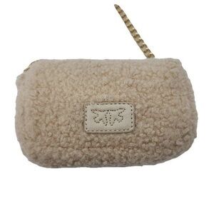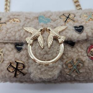 Stylish Pinko crossbody bag in beige. Features unique embellishments and gold chain strap. Perfect for adding flair to any outfit.