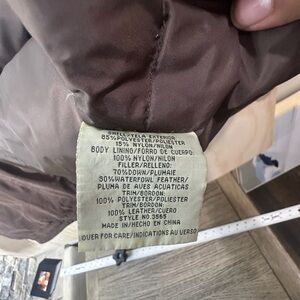 This original windbreaker puffer jacket in a rich brown color features a high collar for added warmth and protection against the cold. Its insulated design ensures comfort during chilly weather, making it a perfect choice for outdoor activities. Pre-owned condition with some normal wear and tear. No huge flaws noted