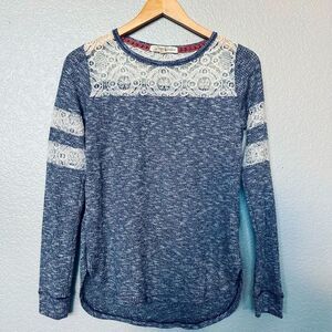 Women’s or junior’s size Small Rewind long sleeve navy blue textured stretchy long sleeve top with cream lace detail. Excellent like new condition, clean nonsmoking home. Approx 17” pit to pit across bust, 12” pit to lower hem side length, 19” pit to wrist sleeve length.