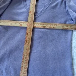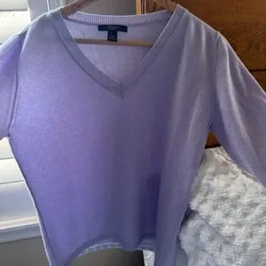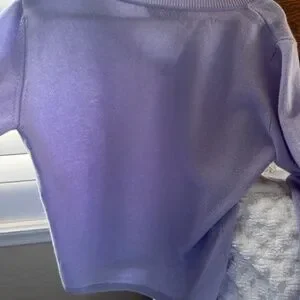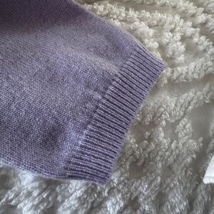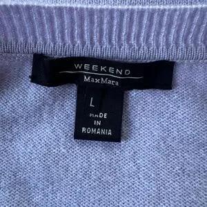 Weekend Max Mura cashmere sweater in a lovely lavender color. This has v-neck styling in a size large. The hem underside has a whimsical blue and white pattern (doesn't show when wearing). Fabric is a lightweight Filato knitting yarn/100% cashmere. Length of sweater from back of the neck is 23"; measurement from underarm to underarm is 19.5". The tags have been removed, but this has not been worn.