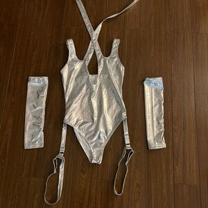 Shiny silver metallic halter bodysuit with garters and matching gloves from iHeartRaves. Perfect for a rave or as a Halloween costume! Never worn