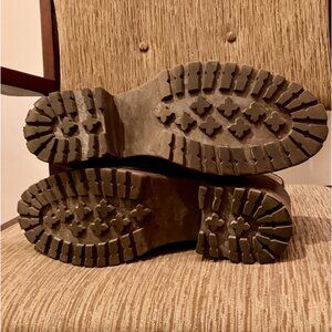 a side zip closure, and a chunky lug sole. They have a low block heel. size 8.5