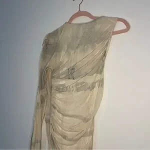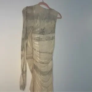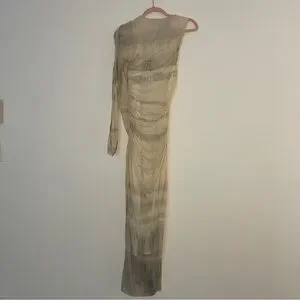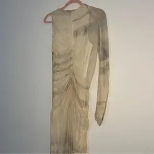 A statement piece that turns heads from every angle. This ZARA one-shoulder maxi dress stuns with its sheer mesh overlay, tie-dye wash in earthy neutrals, and artful ruched draping throughout. The single long sleeve and asymmetrical neckline add an architectural edge, while the bodycon silhouette hugs in all the right places. Fully lined with a back zip for a seamless fit, this dress is the ultimate mix of bold and ethereal.
