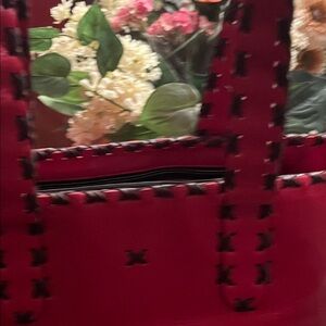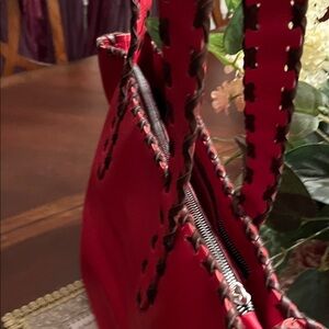 Stylish red leather tote bag with intricate stitching. Perfect for everyday use.