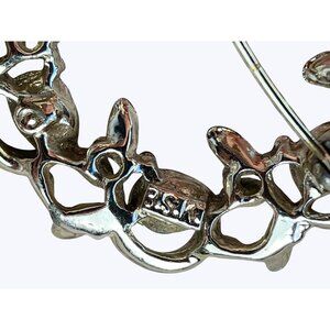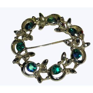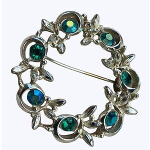 A delicate vintage brooch from BSK, featuring a circle design adorned with green blue rhinestones. The silver-toned finish gives an elegant touch, ideal for accessorizing formal attire or adding a classic flair to casual wear. This well-crafted piece is a timeless addition to any jewelry collection.
