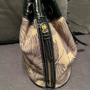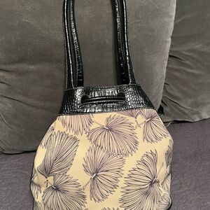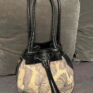 Brahmin Navy & Tan Shoulder Leaf Bucket Bag. Drawstring closure.