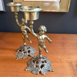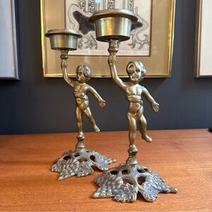 Each 9-inch tall candle holder features adorable cherub motifs, exuding a serene and timeless appeal that's perfect for all occasions. Whether placed on a mantle or as the centerpiece of a dining table, these original pieces are sure to be a conversation starter and a testament to the craftsmanship of a bygone era.