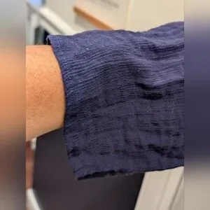 Textured Fabric: The body and sleeves are made of a soft, slightly crinkled, breathable knit fabric.