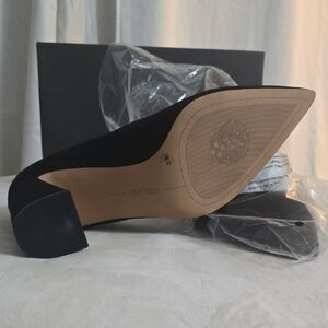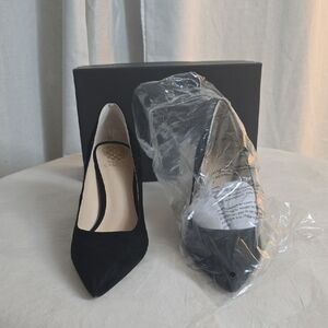 Chic black suede heels by Vince Camuto. Sleek design for versatile wear. still in plastic and box , never worn very stylish office or evening skirts or jeans.