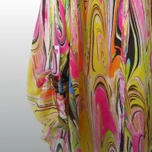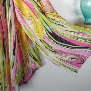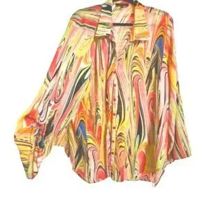 Whether you have a 1970's themed party to attend or wish to elevate your wardrobe, this Melissa Paige Button Down Shirt is the answer. , featuring a vibrant blend of pink and yellow hues. This stylish top is perfect for adding a splash of color to any outfit, making it a versatile choice for both casual and formal occasions.