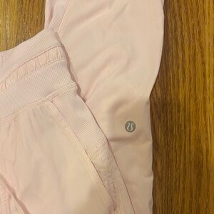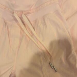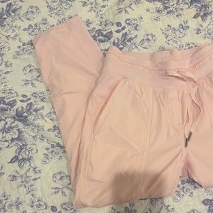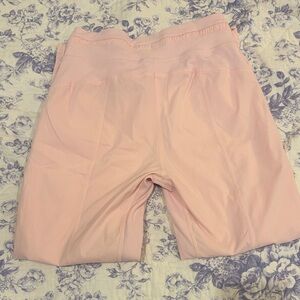Soft pink track pants. Comfortable fit. Drawstring waist. Side pockets.